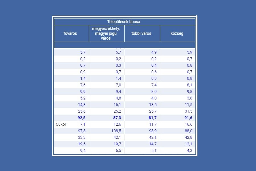 Budapest (7.1 kg) a községek átlagának (16.6 kg!) a felét sem teszi ki. Magyarosch táplálkozáskultúra lenyomat.